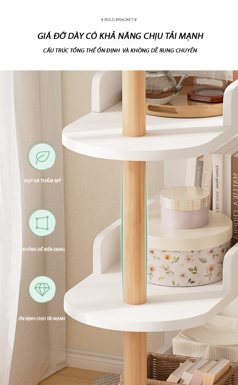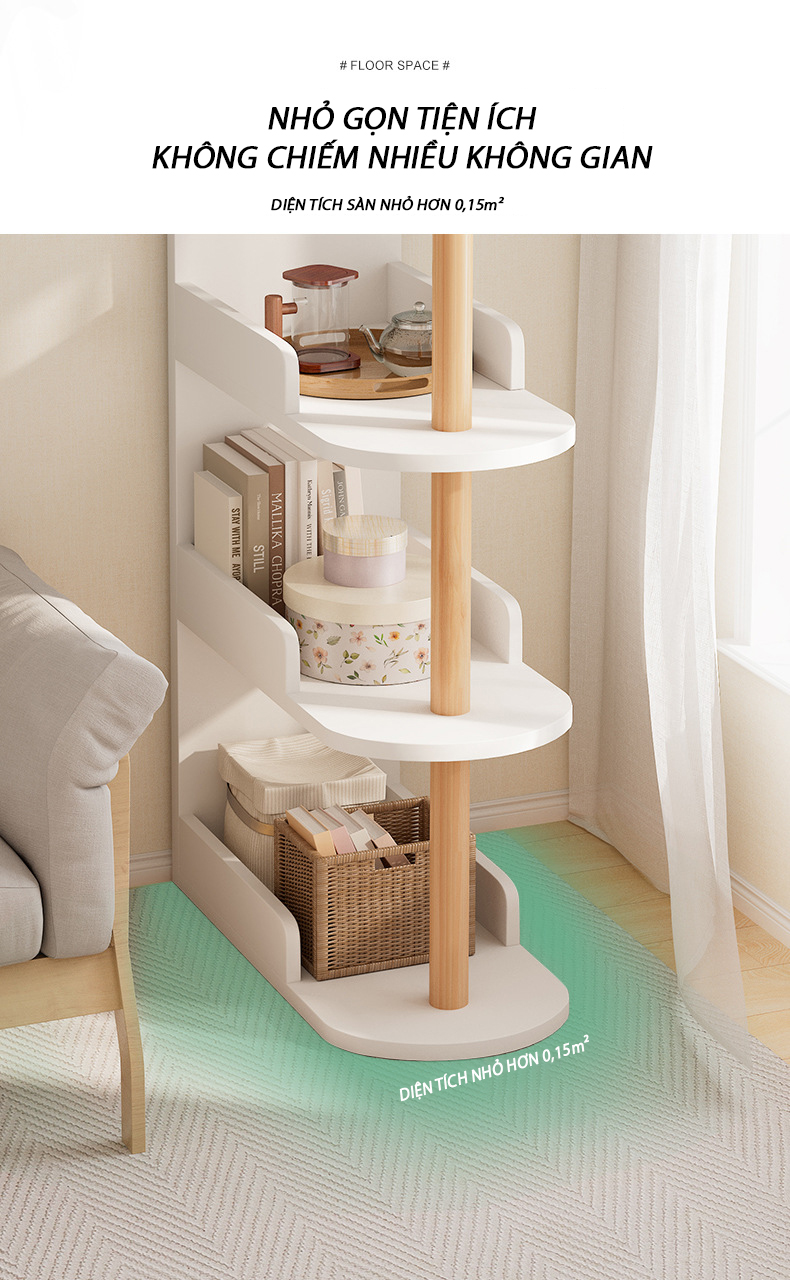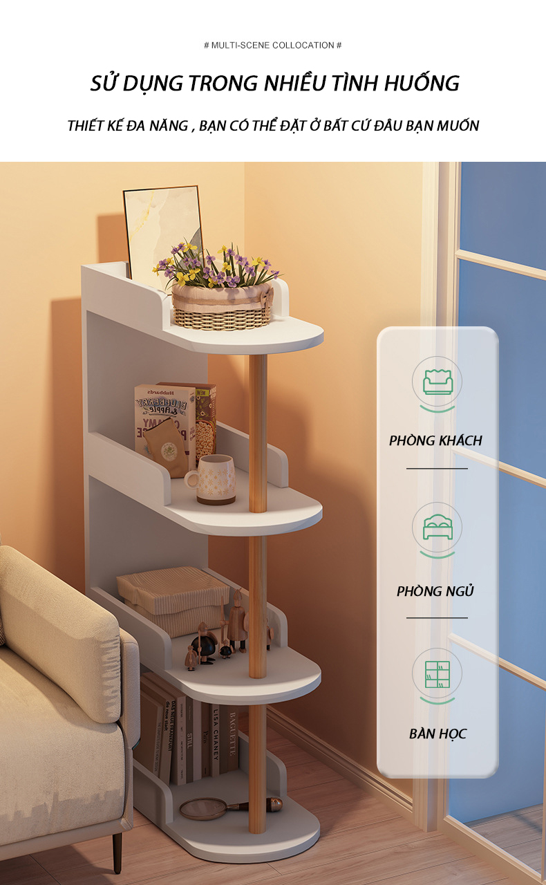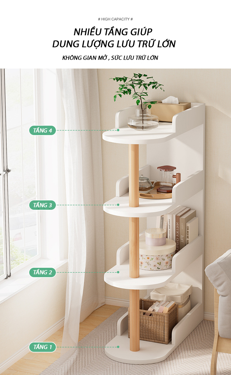 Với thiết kế nhiều tầng, kệ giúp tận dụng tối đa không gian lưu trữ. Bạn có thể sử dụng để đặt sách, cây cảnh, đèn ngủ, điện thoại, đồ trang trí, hộp đựng đồ và nhiều vật dụng khác một cách gọn gàng và tiện lợi.