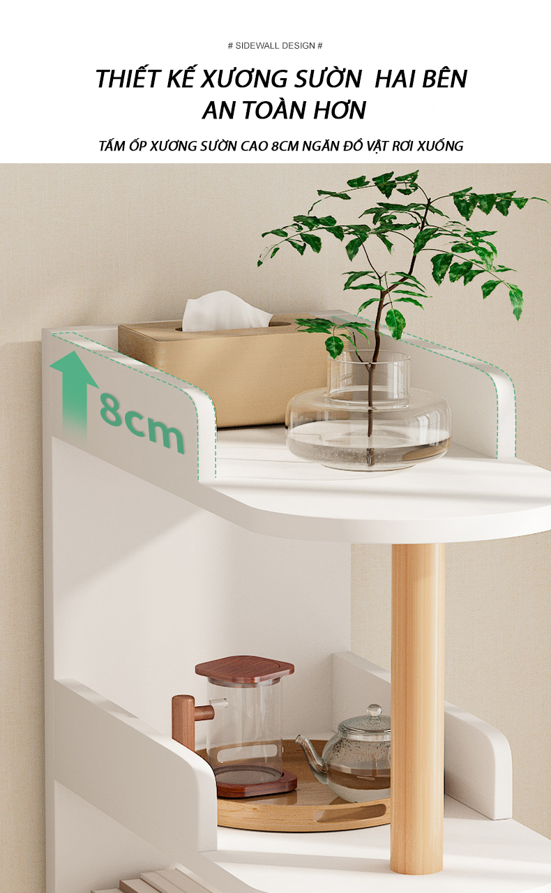 Thành kệ cao 8cm, giúp cố định đồ vật, tránh rơi rớt khi sử dụng. Đây là tính năng đặc biệt hữu ích khi đặt các vật dụng dễ vỡ như đèn ngủ, bình hoa hay đồ trang trí.