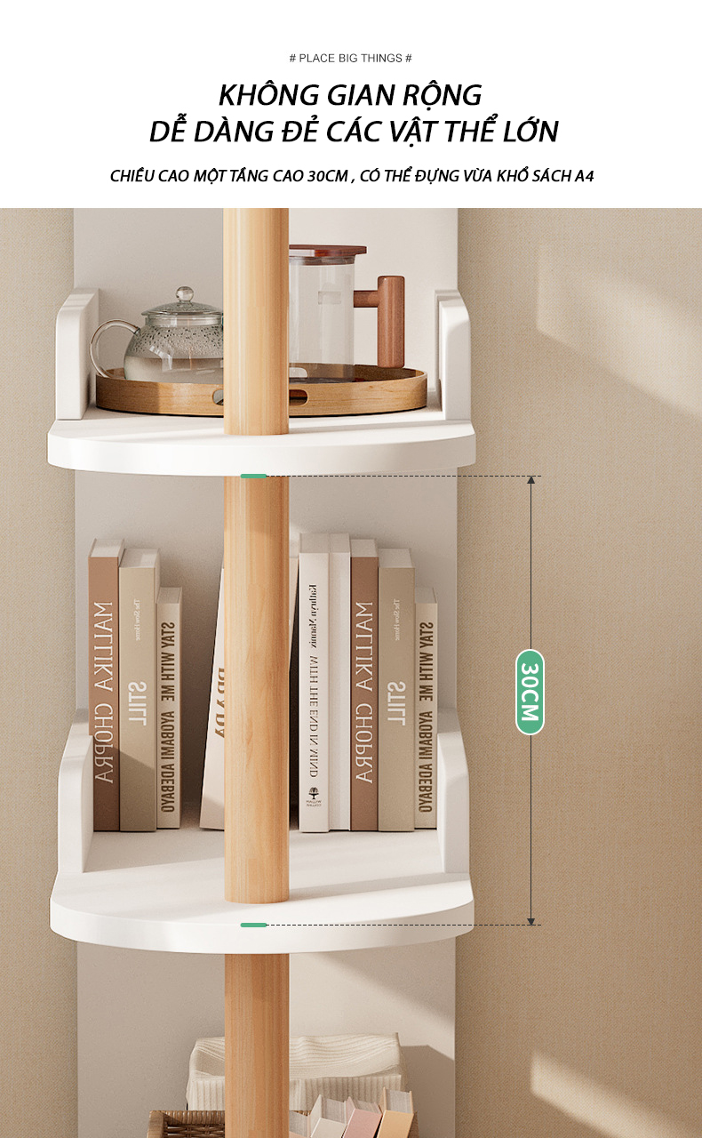 Với chiều cao 30cm giữa các tầng, kệ có thể chứa vừa các vật dụng lớn như sách khổ A4, hộp đựng đồ, thùng lưu trữ,… giúp bạn sắp xếp đồ đạc một cách khoa học và thuận tiện.