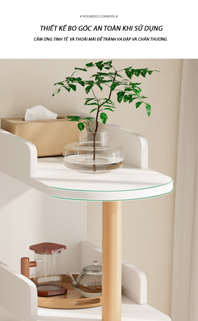 Các góc cạnh của kệ được bo tròn tỉ mỉ, giúp hạn chế va đập, đặc biệt an toàn khi sử dụng trong gia đình có trẻ nhỏ.