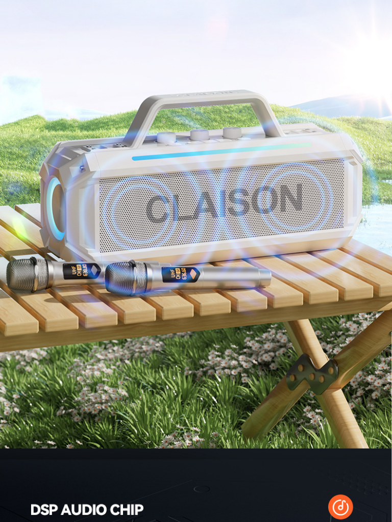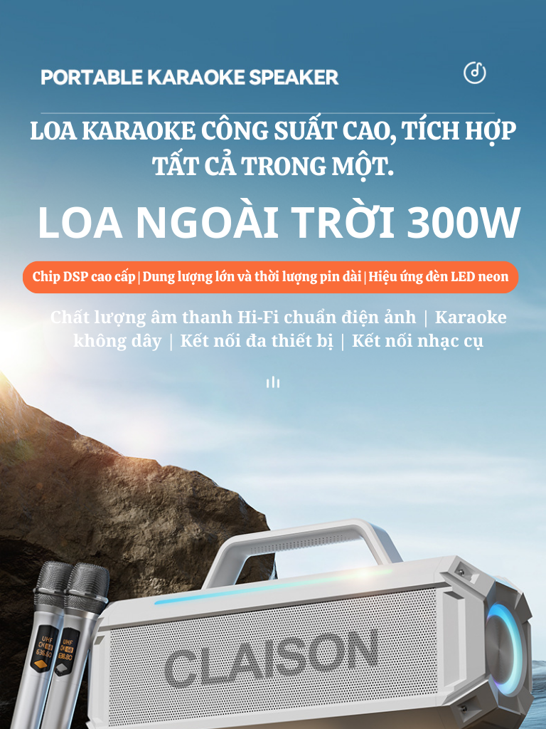 Loa karaoke công suất lớn CLAISON 300W là phiên bản nâng cấp mạnh mẽ với 7 loa – 3 phân tần, chip DSP cao cấp và đèn LED RGB hiện đại. Thiết kế nhỏ gọn – chắc chắn, tích hợp đầy đủ tính năng trong một thiết bị duy nhất, phù hợp sử dụng trong nhà – ngoài trời – tiệc gia đình – dã ngoại – sự kiện nhỏ.
