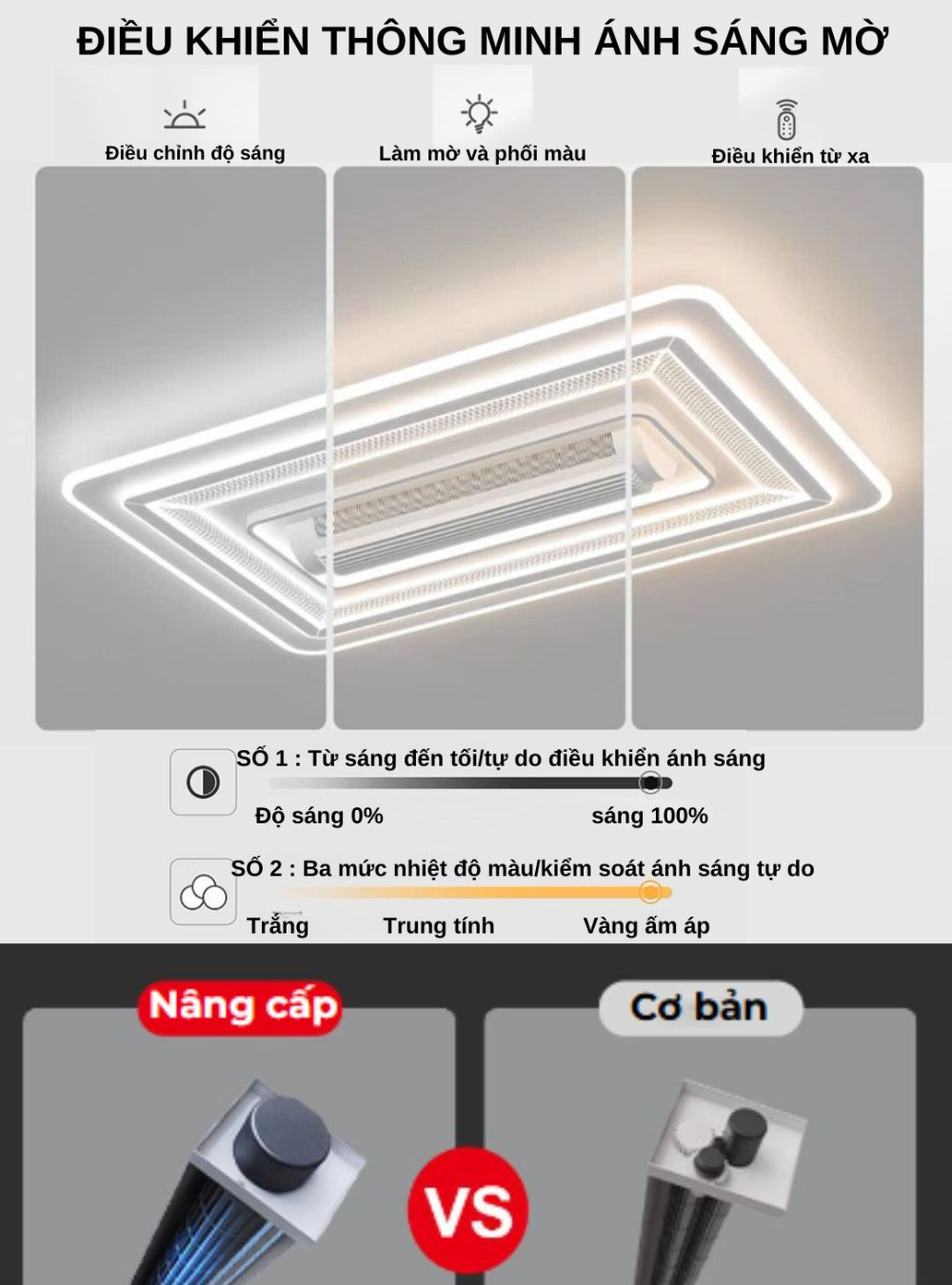 - Tính Năng Bổ Sung: Điều chỉnh độ sáng thông minh, chế độ gió đa cấp, hiệu ứng ánh sáng 360°.